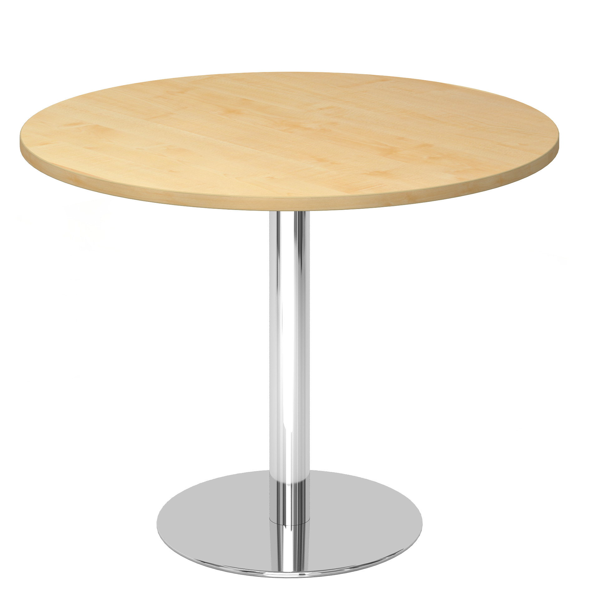 Tischplattenstärke 25 mm. Tellerfuß-Ø 500 mm. Säule und Tellerfuß verchromt.