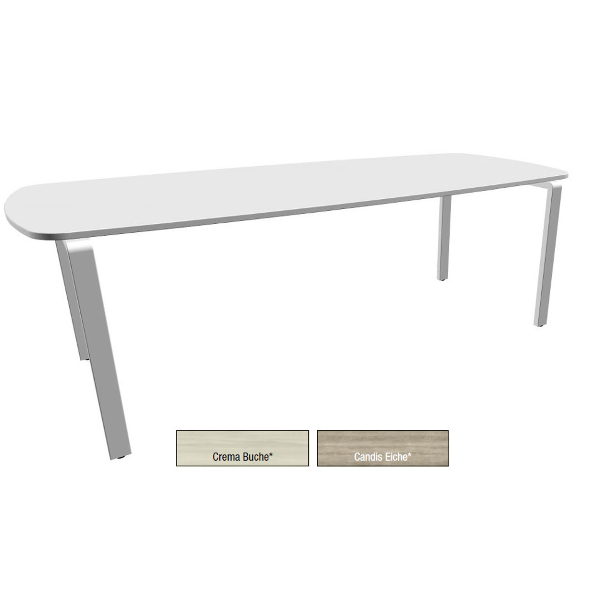 Holzteile aus melaminharzbeschichteten dreischichtigen Gütespanplatten der Emissionsklasse E1 nach DIN EN 14322 in blend- und reflexfreier Micro-Feinstruktur und durch 3 mm PP-Umleimer geschützt. Schreib- und Besprechungstische sind ein verschraubtes freitragendes und modulares Traversensystem. Zwei symmetrisch angeordnete Traversen, in den Stärken 40 x 40 mm, dienen zur Aufnahme der 19 mm starken MDF-Tischplatten. Die Gestell-Seitenteile, mit einem Stahlrohr-Querschnitt von 30 x 60 mm, werden mittels Adapter mit den Traversen verschraubt.