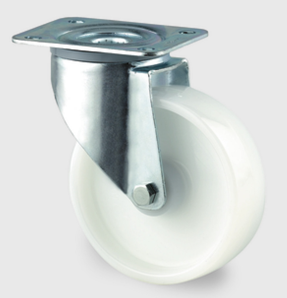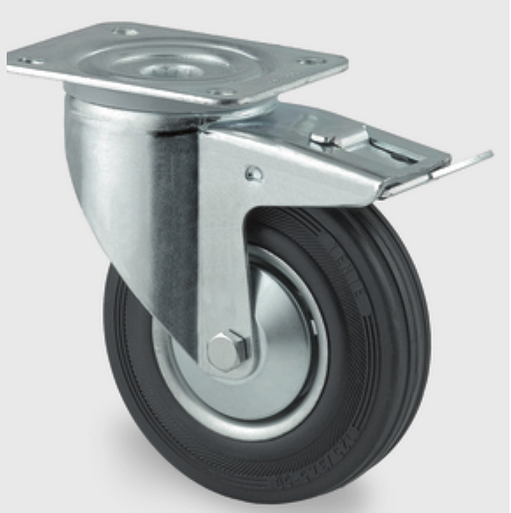 Neben den Klassikern finden Sie im Sortiment von RBB verschiedene Rollen mit Lauffläche aus Polyurethan. Der Radkörper besteht aus Aluminium und einem Kugelrolllager – beide stehen für Belastbarkeit und eine lange Lebensdauer. Das Leng- und Bockgehäuse wird aus verzinktem Stahlblech gefertigt und stellenweise verschweißt, was ebenfalls zur Stabilität beiträgt. Der Feststeller ist ein sogenannter Totalfeststeller. Betätigen Sie ihn, werden Rad und Lenkung gemeinsam blockiert. Kurz gesagt: Die Rolle bleibt bombensicher an Ort und Stelle stehen, auch eine Drehung um die eigene Achse ist ausgeschlossen. Das Polyurethan auf der Lauffläche ist unter anderem gegen Kälte und Hitze, Schmierstoffe, Diesel, Benzin und Heizöl beständig. Selbst stark ätzende, salzhaltige Substanzen machen ihm nichts aus.
