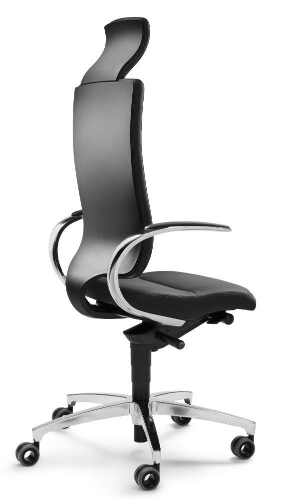 - poliertes Aluminium-Fußkreuz mit lastabhängig gebremsten 65 mm Ø Design-Doppelrollen