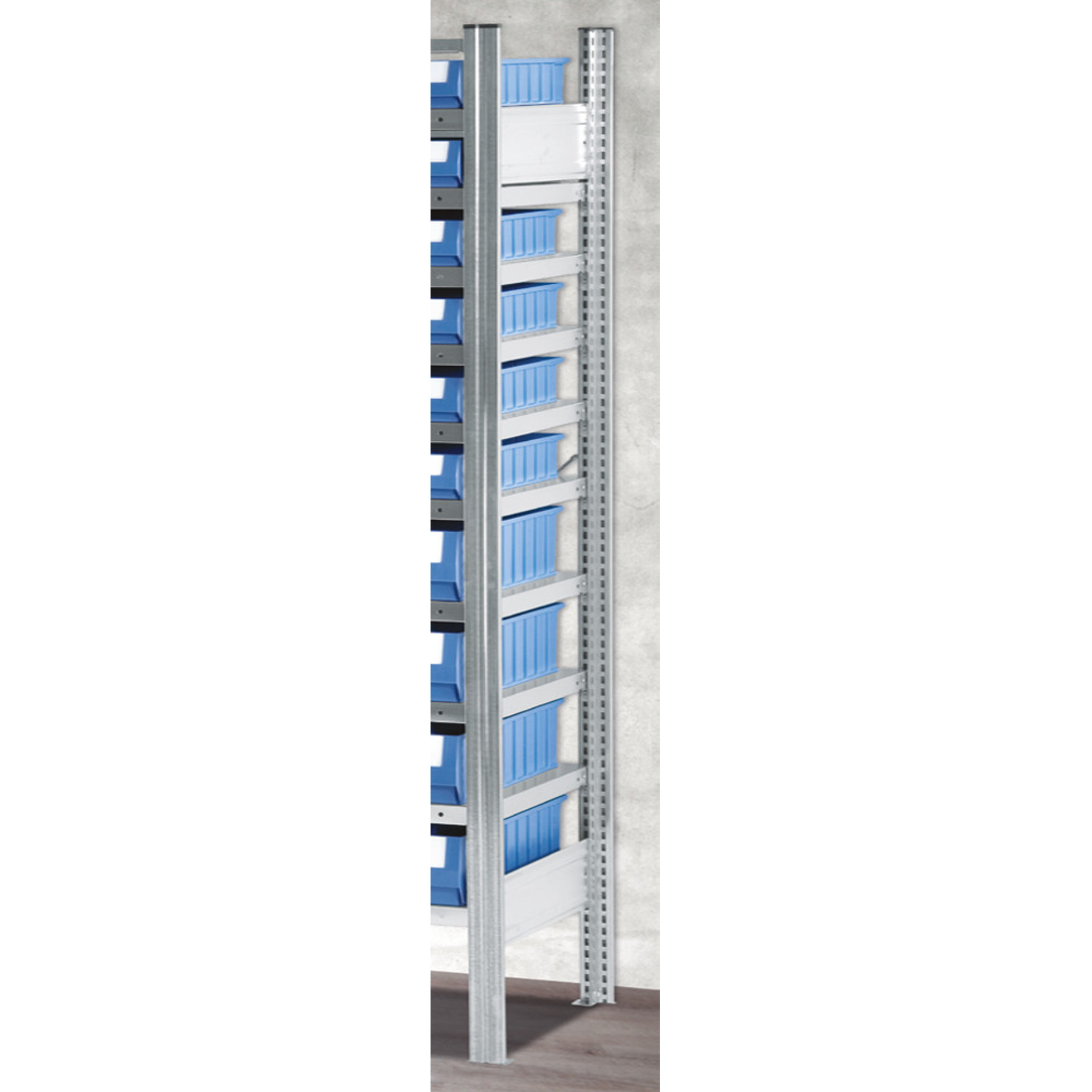 Komplette Seitenrahmen verzinkt, mit T-Stützprofilen 55 x 12 mm inclusive verschraubbaren Stahlfußplatten und oberen Kunststoff-Abdeckkappen. Mit Tiefenstreben. Stützprofil mit Innenlochung für Bodenträger im Raster von 25 mm.