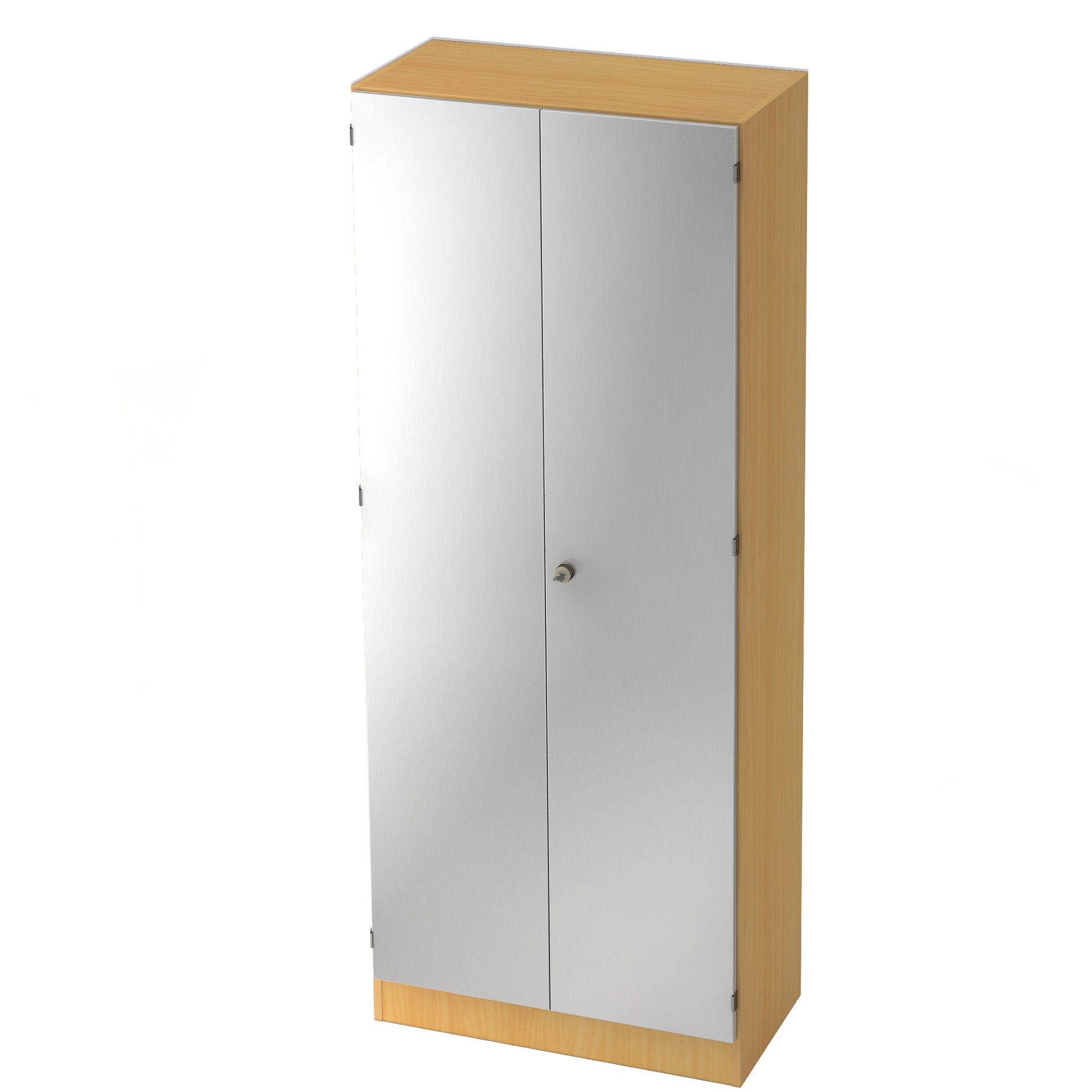 Korpus-Bauweise, d. h. jeder Schrank kann für sich allein stehen. 4 Sockelfüße von innen durch den Boden verstellbar. Vorderkanten mit gerundeten 2-mm-ABS-Kanten. Böden 19 mm stark, im Raster von 32 mm höhenverstellbar auf Metall-Bodenträgern. 2004 mm hohe Türen mit Ganzmetallschloss mit Dreipunktverriegelung. Drehknopf mit Sicherheits-Zylinderschloss. Scharniere 3-dimensional verstellbar in Schnellmontageausführung.