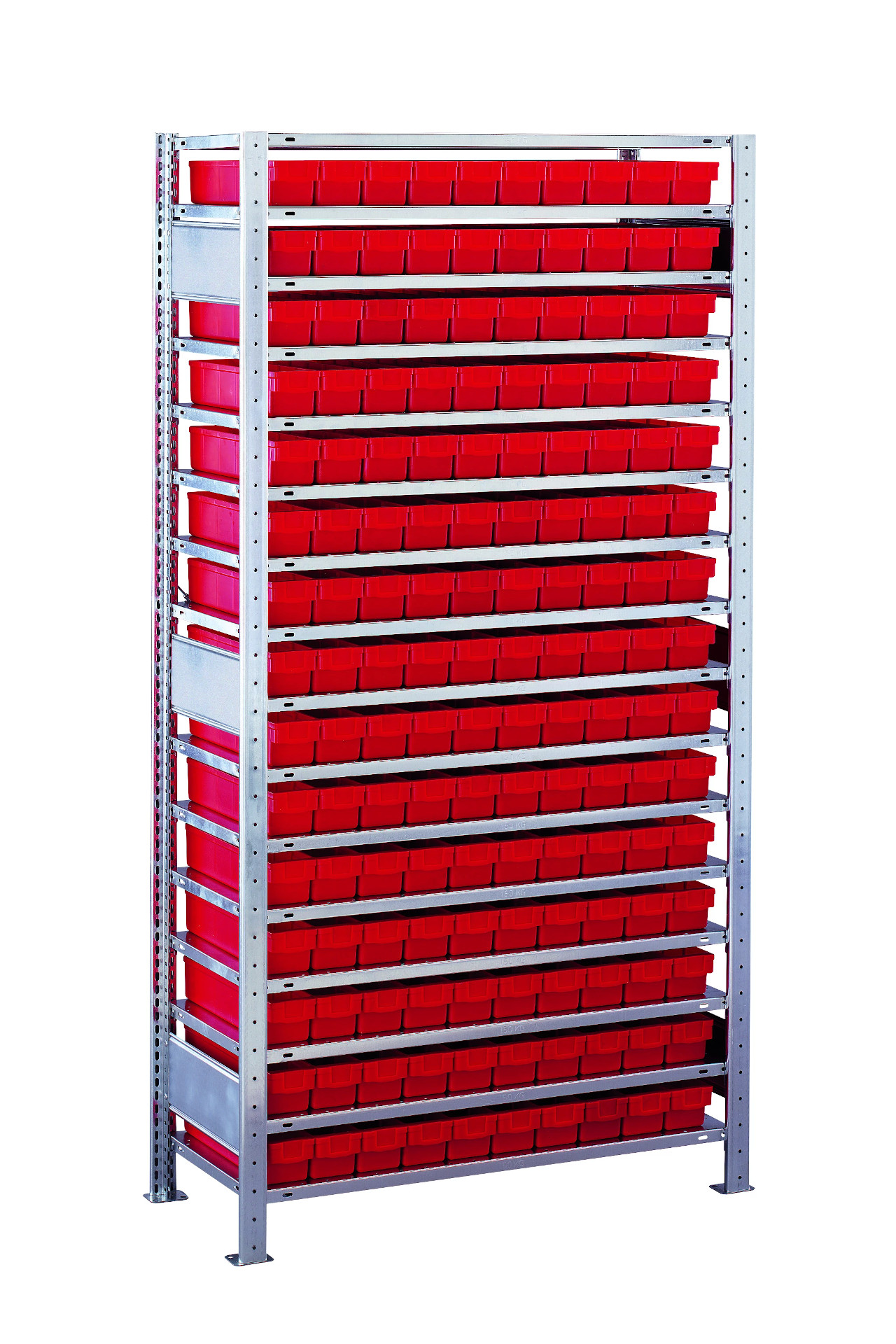 - 150 rote Regalkästen (B93 x T500 x H83 mm) für strukturierte Kleinteilelagerung