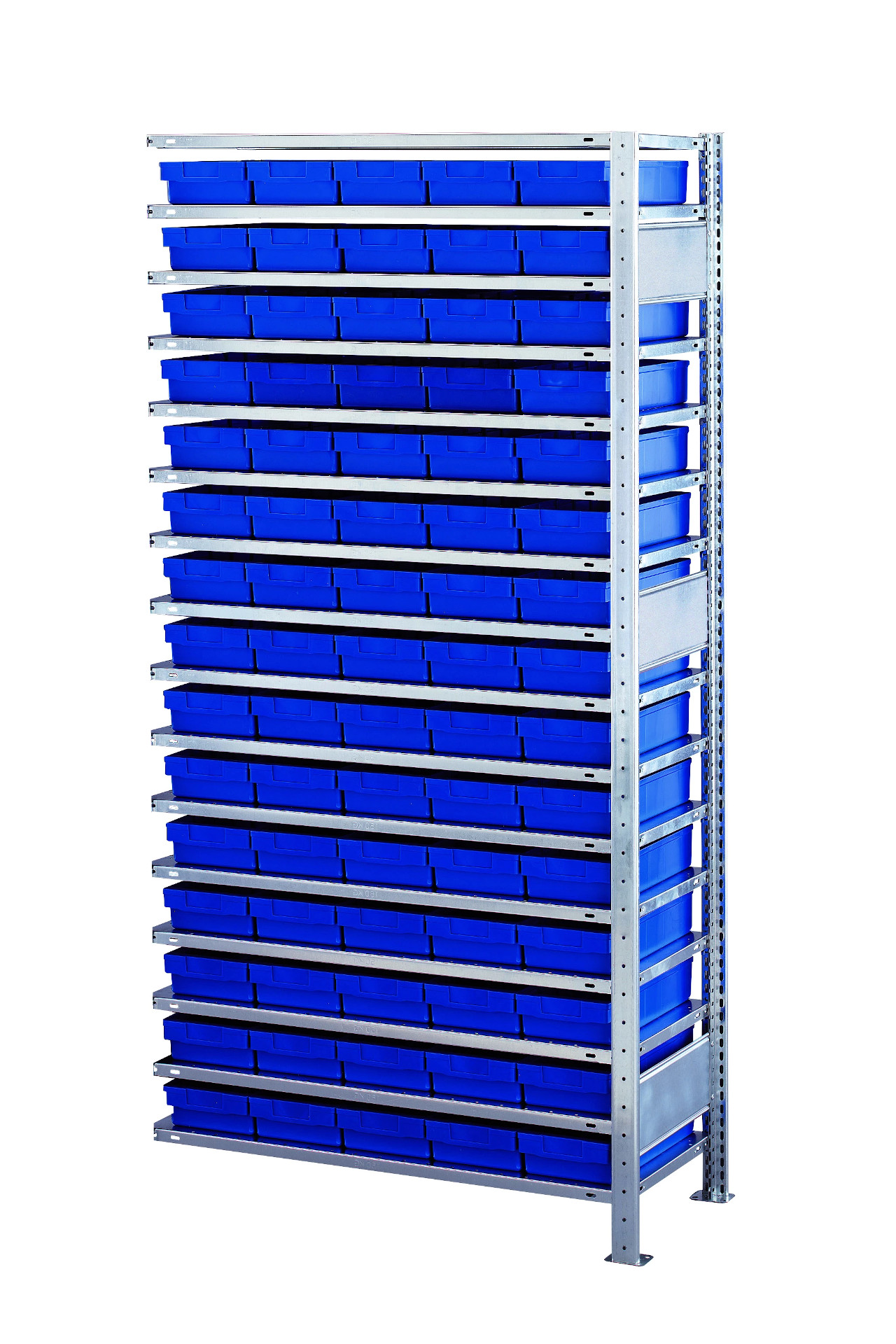 Schulte Anbau-Kleinteileregal-Set 3 Multiplus150, 16 Fachböden, B1000xT300xH2000mm, verzinkt, 75 Regalkästen B186xT300xH83mm, blau