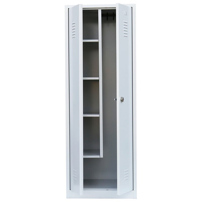 Zwei separate Abteile mit jeweils 300 mm Breite ermöglichen eine übersichtliche Organisation. Im linken Abteil befinden sich vier Fachböden, ideal zur Lagerung von Kleinteilen und Werkzeugen. Das rechte Abteil ist mit einer praktischen Kleiderstange ausgestattet, perfekt zum Aufhängen von Arbeitsbekleidung. Beide Abteile sind mittig schließend und bieten somit zusätzlichen Schutz für Ihre Wertgegenstände.
