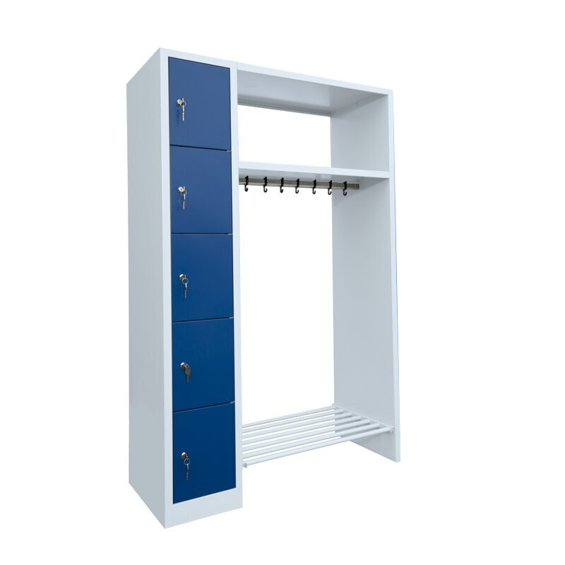 Die Lüllmann Offene Garderobe überzeugt durch ihre langlebige Stahlkonstruktion, die auch dem täglichen Gebrauch standhält. Die fünf abschließbaren Fächer auf der linken Seite bieten optimalen Schutz für Wertsachen und persönliche Gegenstände. Jedes Fach ist mit einem zuverlässigen Zylinderschloss und zwei Schlüsseln ausgestattet.