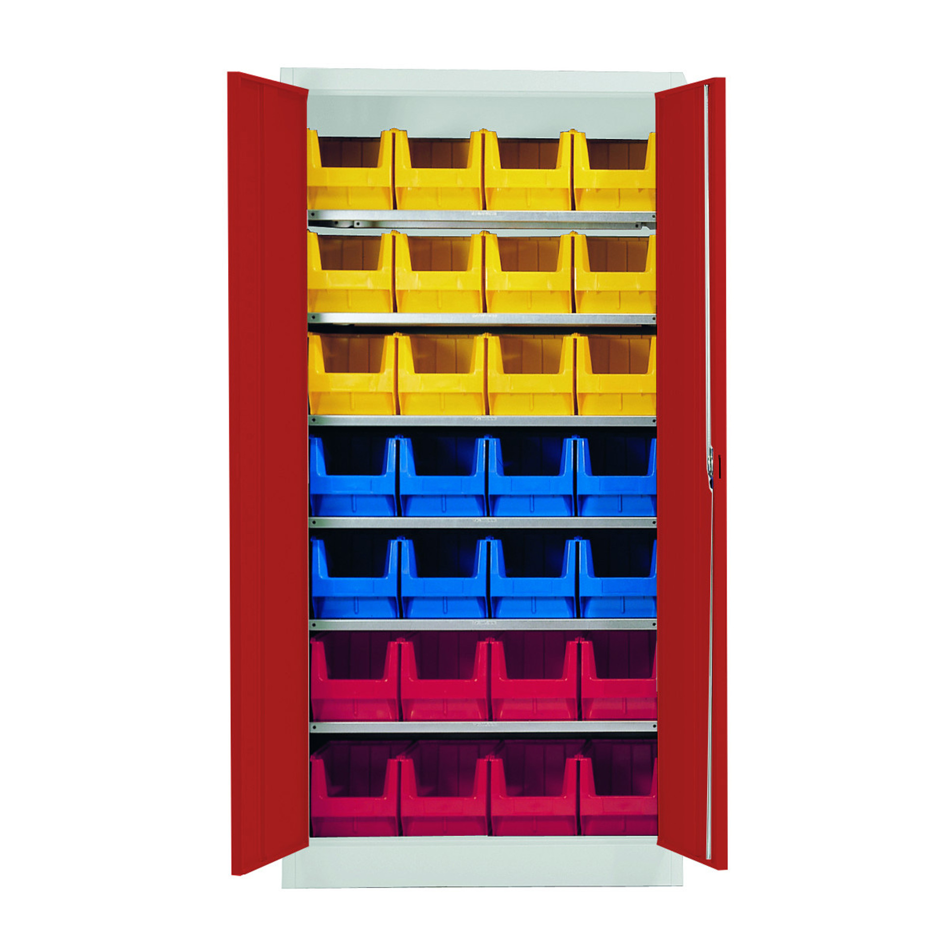 Mit dem Stahlschrank Typ 959-V6 kaufen Sie insgesamt 500 kg Tragkraft. Beladen Sie die einzelnen Böden nicht mit mehr als 65 kg. Größere Maschinen finden hier auf jeden Fall Platz. Auch, wenn Sie Kleinteile in dem hohen Schrank lagern möchten, ist das kein Problem. Auf sechs verzinkten Stahlböden haben 28 Sichtlagerkästen der Größe 3 Platz. Im Lieferumfang enthalten sind je acht rote und blaue Kästen und 12 gelbe. Die Böden haben eine Sicherheitsabkantung von 25 mm.