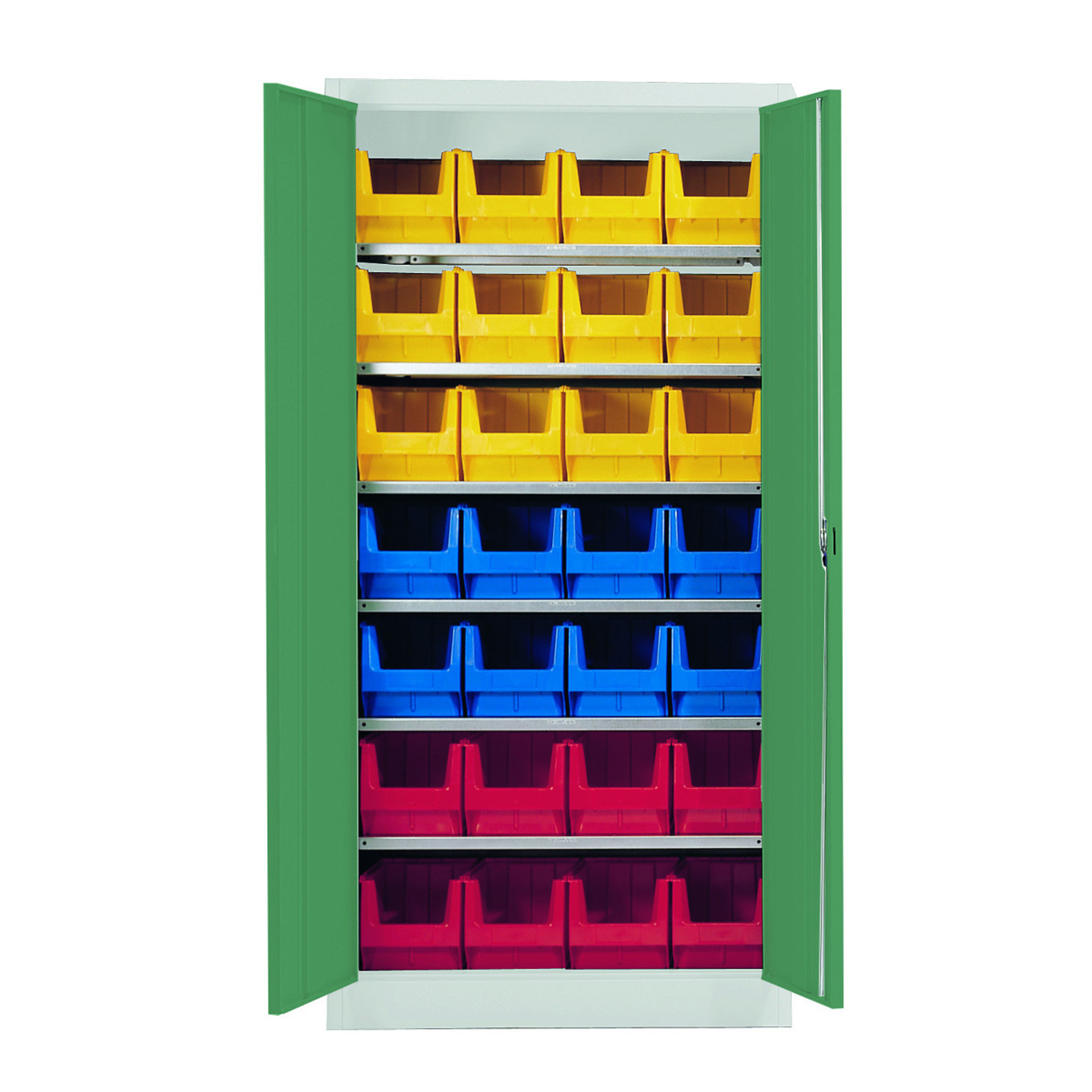 Mit dem Stahlschrank Typ 959-V6 kaufen Sie insgesamt 500 kg Tragkraft. Beladen Sie die einzelnen Böden nicht mit mehr als 65 kg. Größere Maschinen finden hier auf jeden Fall Platz. Auch, wenn Sie Kleinteile in dem hohen Schrank lagern möchten, ist das kein Problem. Auf sechs verzinkten Stahlböden haben 28 Sichtlagerkästen der Größe 3 Platz. Im Lieferumfang enthalten sind je acht rote und blaue Kästen und 12 gelbe. Die Böden haben eine Sicherheitsabkantung von 25 mm.