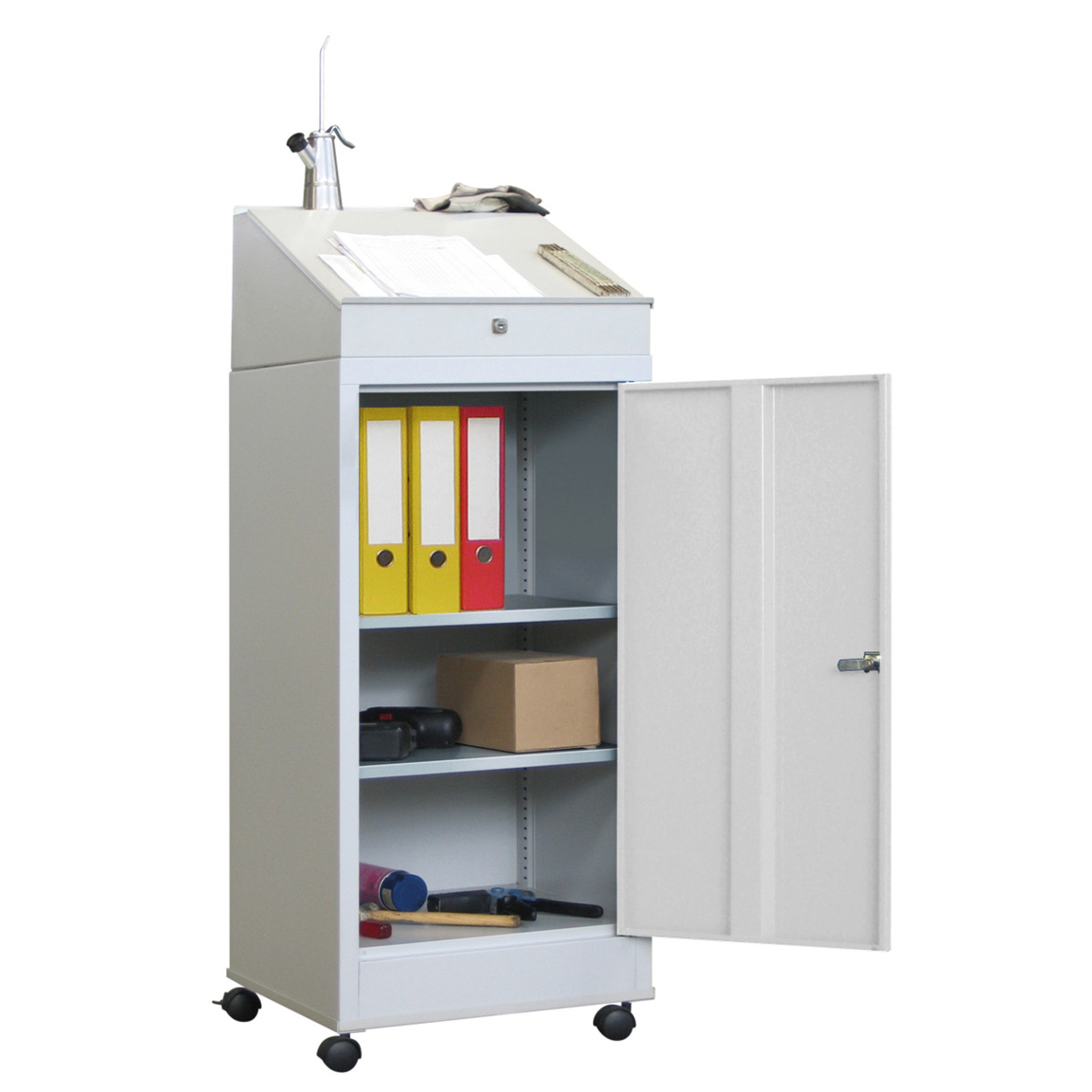 im Schrank 2 verstellbare verzinkte Stahlböden. Schreibpult mit klappbaren Deckel, mit Abrollkante. Schrank und Schreibpult mit je 1 Zylinderschloss.