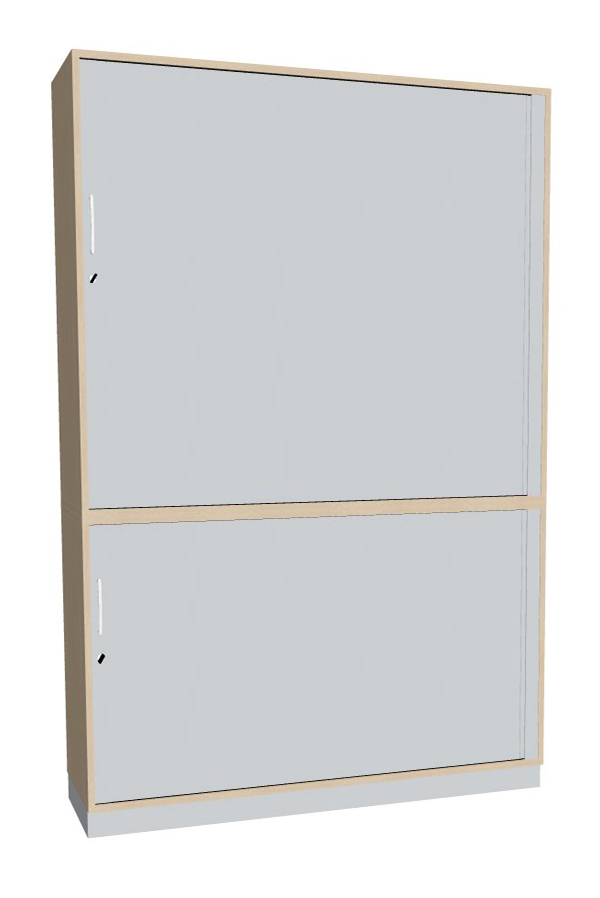 Schrankkorpus komplett verleimt. Eingesetzt werden qualitativ hochwertige Dreischicht-Feinspanplatten mit direkter Melaminharz-Beschichtung nach DIN EN 14322 in Uni-Oberflächen bzw. Holz-Dekoren, allseitig mit 2 mm Umleimer aus PP (Laser Technik) bekantet. Seitenwände, Ober- und Unterboden 19 mm und Rückwand 8 mm stark. Ab Schrank-Aufstellung mit 5 Ordner-Höhen empfehlen wir gegen Mehrpreis Wandbefestigung (WW).