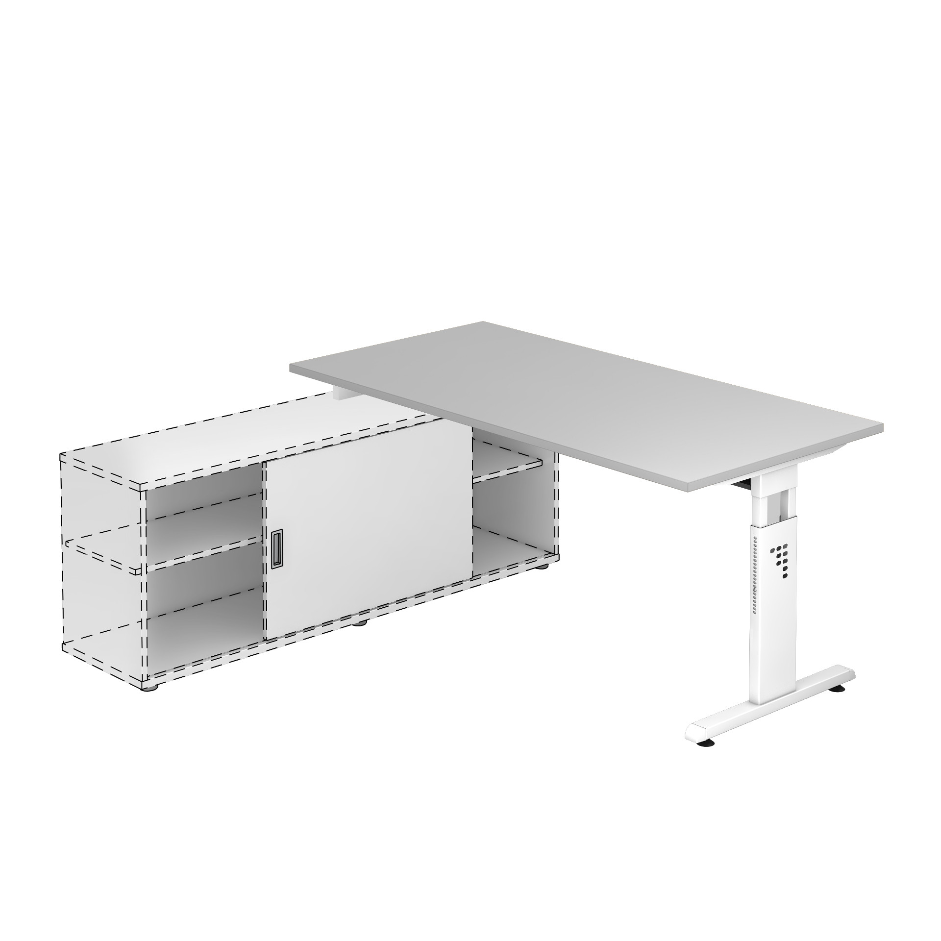 Tischplatten 25 mm stark mit gerundeten 2-mm-ABS-Kanten, aus melaminharzbeschichteten Spanplatten nach DIN 68765, Emissionsklasse E1 in blend- und reflexfreier Micro-Feinstruktur. Massiver alufarbiger Stahlrahmen, mit weißem T-Fußgestell, höhenverstellbar in Stufen von 720/750/780 mm. 2 Kurzbeine für die Anbringung auf dem Sideboard. Kabelkanal und Kabelspirale sind optional bestellbar.