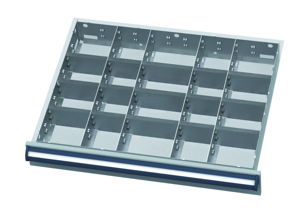 Unterteilung in 20 Fächer: 6 je 100, 6 je 125, 3 je 150 mm