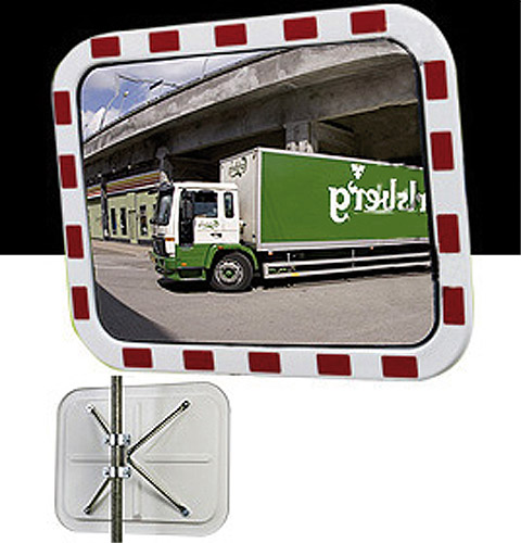 Dieser Spiegel ist sehr gut geeignet, um die Sicherheit im Straßenverkehr, in Hoch- und Tiefgaragen, auf privaten Fahrwegen, in Einkaufszentren, Produktionsstätten, auf Freiflächen usw. zu erhöhen. Das Besondere sind die Reflektoren, die sich auf dem Rahmen befinden und den Bestimmungen der Verkehrsbehörden entsprechen, besonders bei schlechter Witterung und Dunkelheit. Der Spiegel wird mit Silikon in einem stabilen Rahmen befestigt, dieser verfügt über Verstärkungen auf der Rückseite. Die mitgelieferte Vierpunkt-Kugelgelenk-Halterung ermöglicht eine optimale und ganz exakte Positionierung. Befestigung sowohl an Wänden, als auch an Pfosten (Durchmesser 50 - 80mm) möglich. Der montierte Spiegel ist auf eine Windbelastung von 24 KN getestet. Er ist TÜV-geprüft.